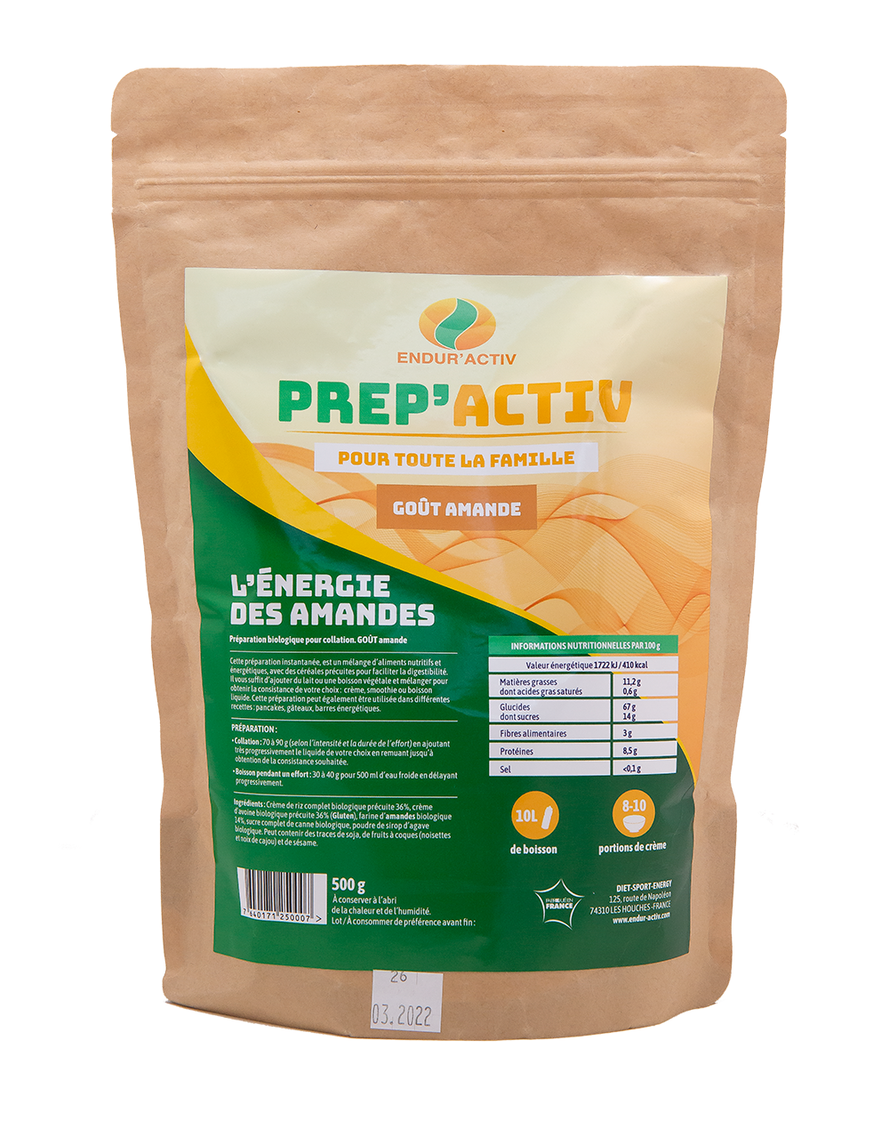 La PREP’ACTIV permettra la recharge en glucides indispensable pour reconstituer le stock de glycogène et celle en acides aminés (BCAA d’origine végétales -amande et riz)